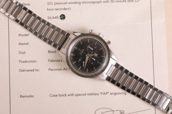 Models 2915-1 to -3 were produced from 1957 to 1959, in just three years, with an estimated production volume of 3,000-4,000. There are watches that tell stories. Sometimes just by looking at them, they will begin to evoke a distant story …almost whispered. Sometimes you will be lucky enough to find someone who will tell it to you because they have lived it. Very often the history or signs of time in a vintage watch are more important than the time it has been ticking for so many years …this already iconic watch , also has a great history because it was assigned Fuerza Aerea del Peru (FAP). The military use together with its condition make this masterpiece one of the most important Speedmasters ever produced.