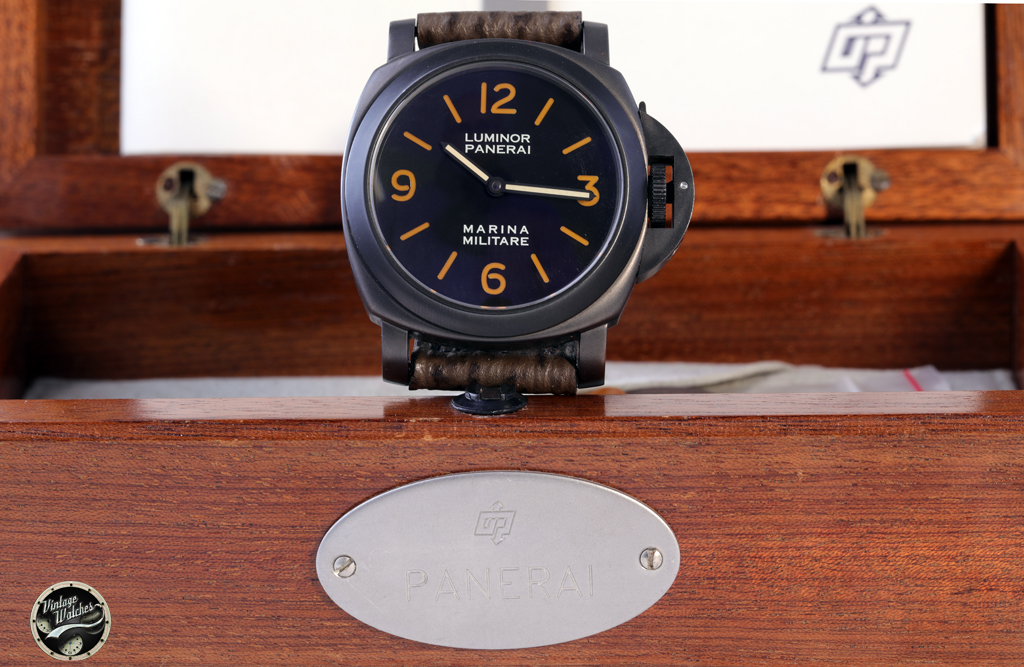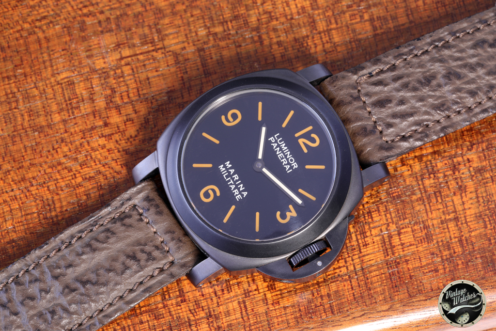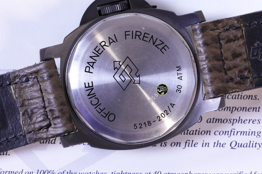 Uno degli elementi più iconici del Panerai 5218 202/A è senza dubbio la sua cassa rivestita in PVD (Physical Vapor Deposition). Questo trattamento conferisce all’orologio una finitura opaca nera particolarmente resistente ai graffi e all’usura, esaltando il carattere robusto e militare del modello. La cassa in PVD, oltre a proteggere l’acciaio sottostante, regala all’orologio un aspetto deciso e contemporaneo, mantenendo allo stesso tempo un legame con l’estetica originale dei primi Panerai destinati alla Marina.