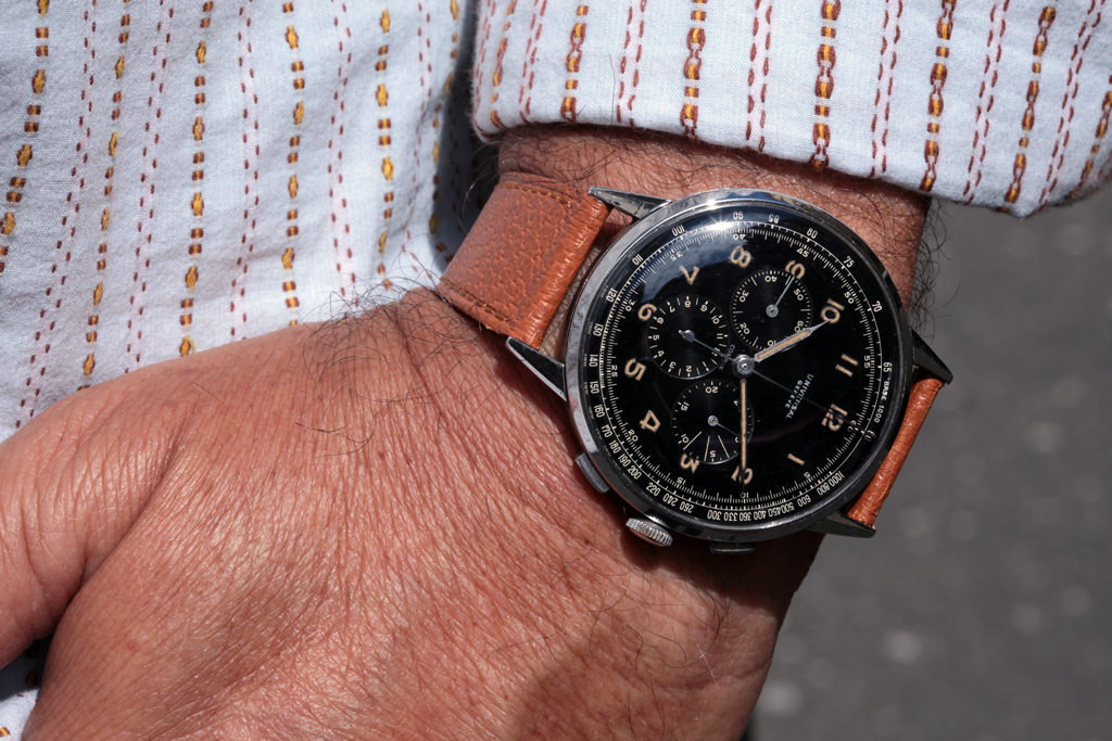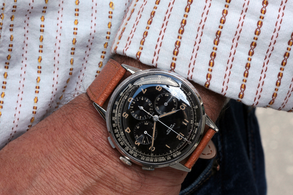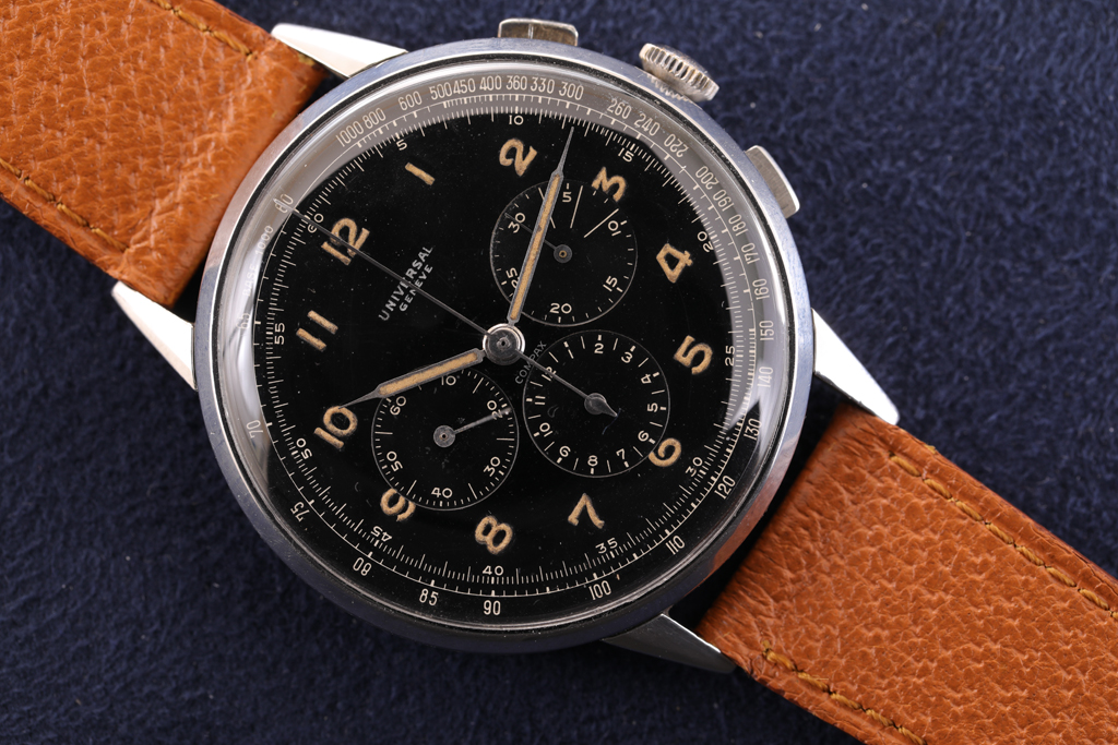L’Universal Compax è stato prodotto in numerose versioni nel corso degli anni sia in oro che in acciaio. I più ricercati sono i modelli con casse grandi, i cosiddetti modelli oversize, come questo esempio, referenza 22430. Dotato di una cassa dal diametro sorprendente di 46 mm, questo UG è sicuramente uno dei modelli Compax più audaci e grandi prodotti da Universal. Soprannominato Universalone, prodotto intorno agli anni ’40.